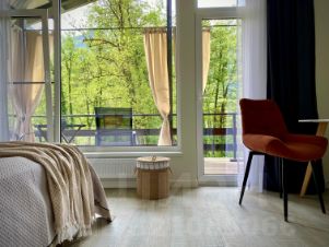 Новый уютный апартамент 45 кв. м.(половина дома, в котором вы будете одни) с отличным расположением, с видом на лес и горы. В двух минутах ходьбы множество магазинов (Магнит, Пятерочка, Золотая Нива, ВкусВилл...), кафе (Серф Кофе, Провинция, Мимино...), остановка общественного транспорта. До горнолыжных курортов 7 минут на машине.