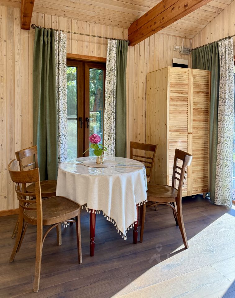 Посещение бани на дровах в подарок для новых гостей! Уютный дом для пары с отдельным входом, террасой, высокими потолками и видом на сад. Большая двуспальная кровать, просторный санузел с душевой зоной, кондиционер, ТВ, Wi-Fi, чайник и холодильник, мультиварка, минимальный набор посуды и столовых приборов. Также можно воспользоваться мангалом.