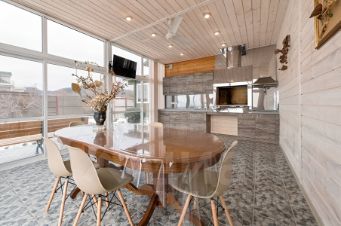 — Мангальная беседка с большим мангалом, мощной вытяжкой, ТВ, с панорамными раздвижными дверьми.
