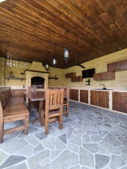 БАРБЕКЮ: Зона с мангалом и вертелом + полноценная Летняя Кухня . Укомплектована всей необходимой техникой: холодильник, морозильная камера, СВЧ, духовой шкаф, варочная поверхность, посудомоечная машина, фильтр для воды, ТВ, профессиональный звук (колонки). Рольставни закрываются от пульта.