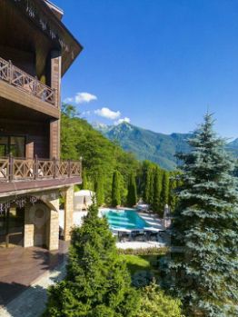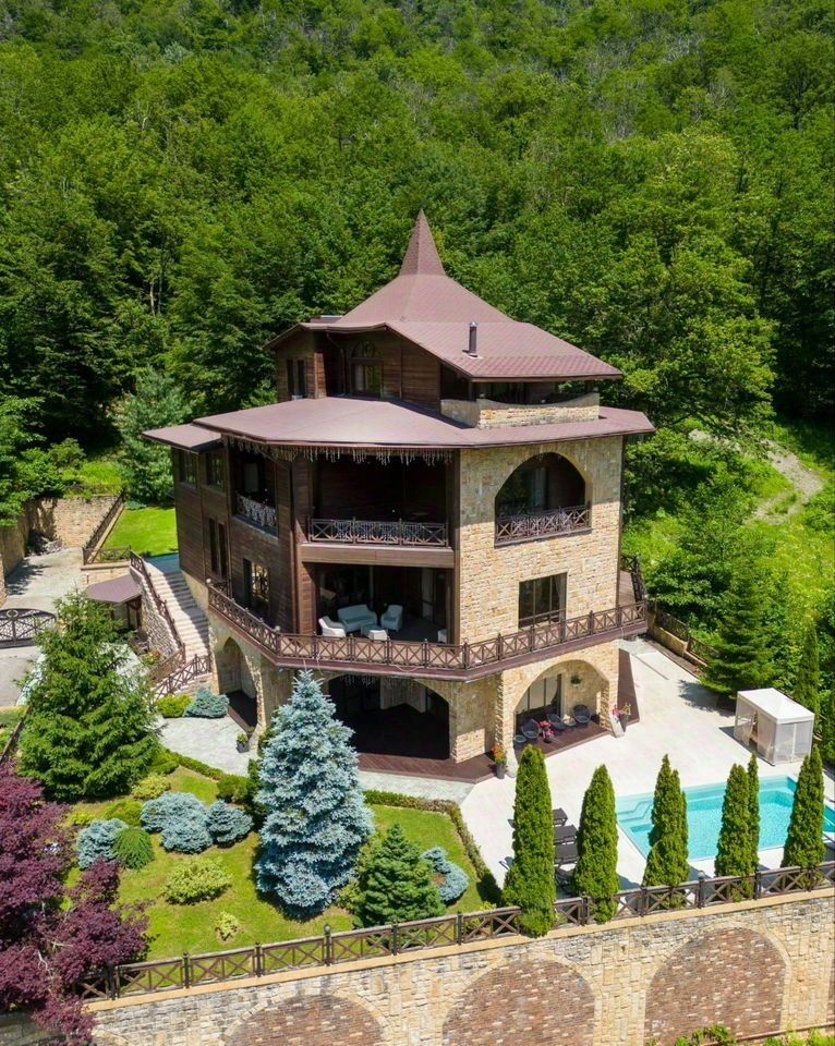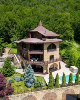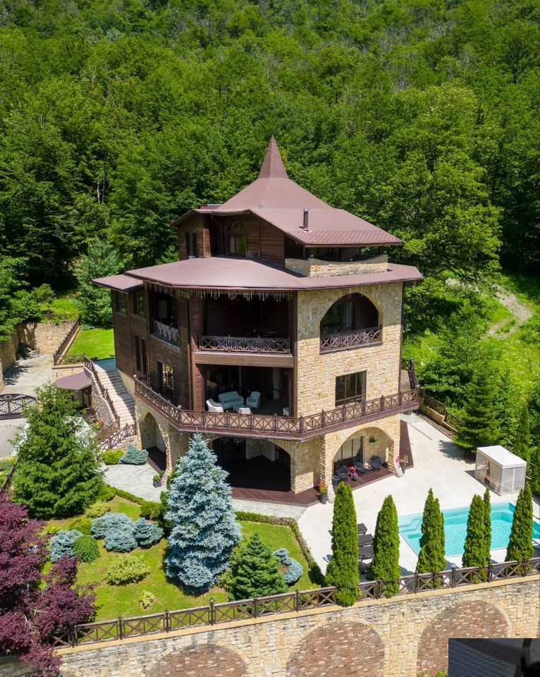 На просторной ухоженной территории вас ждёт четырёхэтажный дом с панорамными видами на горы, современный спа-комплекс, бассейн, зона отдыха с беседкой, мангалом и зелёным садом, а также удобная парковка на четыре автомобиля.