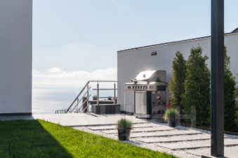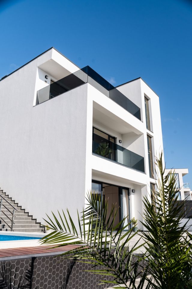 Панорамные окна во всех комнатах наполняют пространство естественным светом, позволяя наслаждаться потрясающими видами с любого уголка виллы. Широкая терраса, частично крытая, является идеальным местом для обедов на свежем воздухе, отдыха или любования захватывающими закатами.