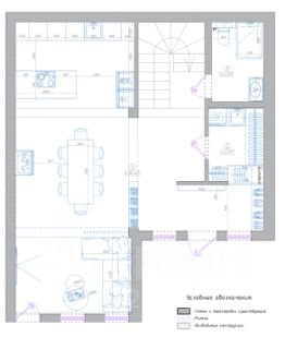 ПЕРВЫЙ ЭТАЖ представляет собой большое открытое пространство, включающее в себя прихожую, кухню с комплектом необходимой бытовой техники, столовую с действующим дровяным камином, а также ТВ зону с диваном. Также на первом этаже есть свой санузел и небольшая постирочная комната со стиральной машиной и гладильной доской.