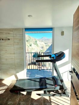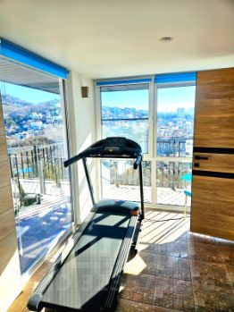 Просторный санузел с панорамным видом и беговой дорожкой.