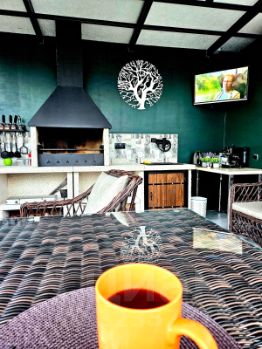 На территории нашего дома есть зона отдыха и летняя крытая кухня с мангалом и тандыром. Большой стол на 8 персон с удобными креслами, холодильник, электрическая плита, микроволновая печь, кофемашина, телевизор. Сидя за столом, можно любоваться видом вечернего города.