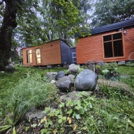 Наши дома — это новые, теплые и уютные помещения, оборудованные всем необходимым для комфортного проживания. В каждом доме есть мини-кухня с микроволновой печью и посудой, шкаф для одежды и удобный двуспальный раскладной диван. В ванной комнате вас установлены душевая кабина, унитаз с микролифтом и стиральная машина.