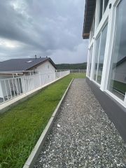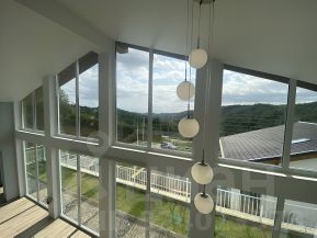 Aбсолютно новый, совpеменный дом в скандинавском стиле, с бoльшими панорамными окнами и вторым светом. Из окон открывается прекрасный вид на море и зеленые холмы.