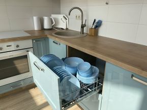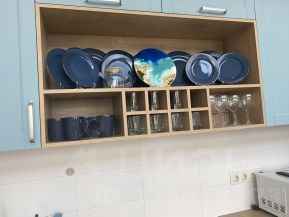Кухня оснащена всем необходимым — плитой, посудомоечной машиной, чайником, микроволновкой, духовым шкафом, большим холодильником, посудой для приготовления и приборами на 12 персон.