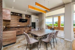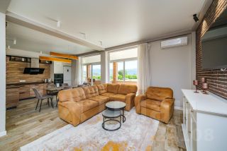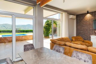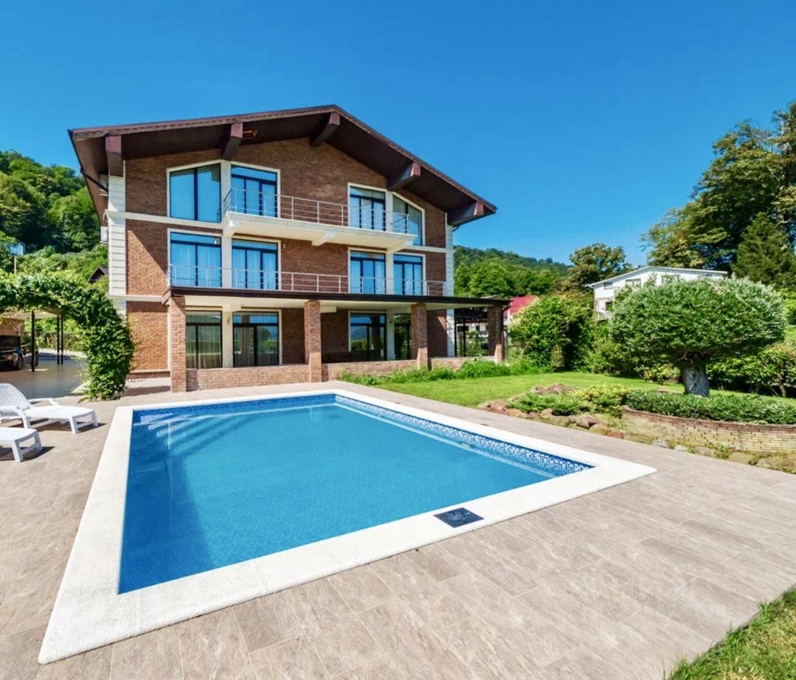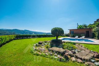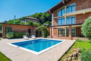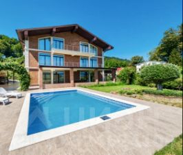 Красивая территория с ландшафтным дизайном, есть теплый бассейн (5*6 метров, глубина 1,4 м), отдельно стоящая баня, а также зона для барбекю