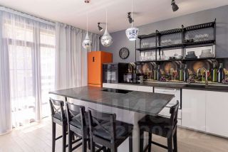 Полностью оборудованная кухня — холодильник, плита, микроволновка, чайник.