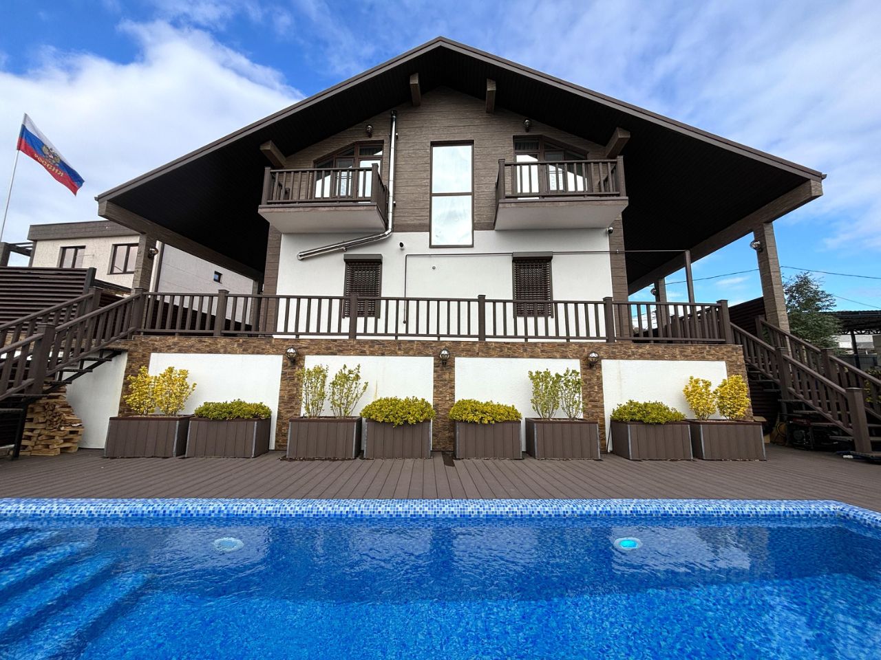 Tech Шале премиум-класса 2 этажа и 4 спальни. Подогреваемый бассейн 8х3 и приватная закрытая территория с террасой. 20 минут от Сириуса и набережной/40 минут до Красной поляны. Отдельный кабинет с рабочим местом.