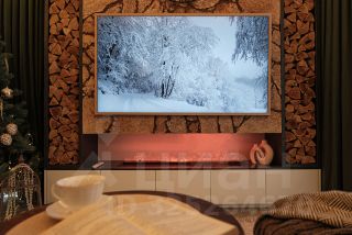 - смарт ТВ с диагональю 65, паровой электрокамин с эффектом дыма и пультом, комфортный диван и шторы с электроприводом. Яндекс станция;
