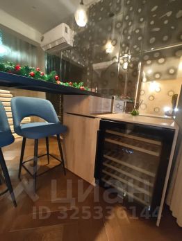 В гостиной - уютная lounge зона, барная стойка, высокие велюровые стулья, винный шкаф, бокалы, балкон и панорамные окна с видом на горы.