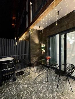 Своя терраса с барбекю, столик, стулья.