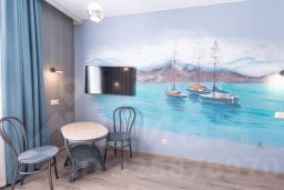 В номере: 2 раздельные полутора-спальные кровати с прикроватными тумбочками, телевизор, диван, два кресла с журнальным столиком, комод, кондиционер. Полный санузел с ванной, прихожая, шкаф.