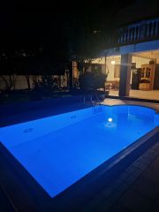 Во дворе бассейн с лежаками, сад, открытая терраса с обеденной зоной и мангалом, теннисный стол, баня на дровах (за доп. Плату).