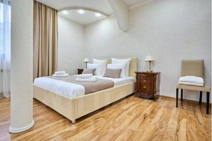 Поднимитесь на этаж, где роскошь кухни дополнена восхитительными панорамами из окон. Здесь расположены две отдельные зоны отдыха. Просторный семейный номер (комнаты 34 и 27 кв.м.) с двумя двуспальными и одной односпальной кроватью, гардеробами, телевизорами и собственной ванной. А также изысканный однокомнатный номер-люкс (39 кв.м.) с прихожей, персональным санузлом, двуспальной кроватью и всем необходимым для отдыха.