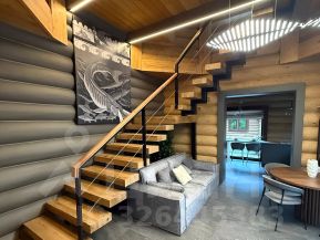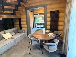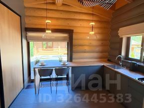 Включает в себя просторную гостиную с панорамными окнами и видом на участок, отдельную кухню, санузел и спальню на верхнем уровне.