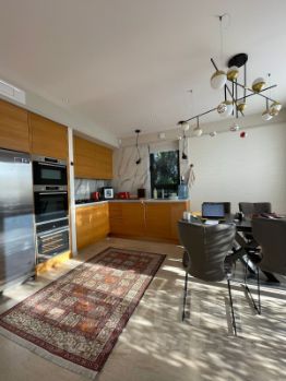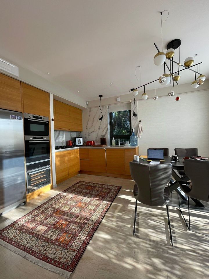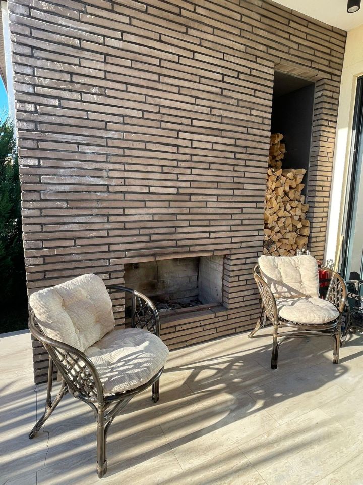 На первом этаже дома просторная кухня-гостиная с мощной встроенной системой кондиционирования, выходом на террасу, диван-трансформер, удобные кресла-качели, камин, дровни, открывается прекрасный вид на море. Также на первом этаже дома расположены технические помещения для хранения бытовой техники и отдельный санузел с писсуаром и душевой кабиной.