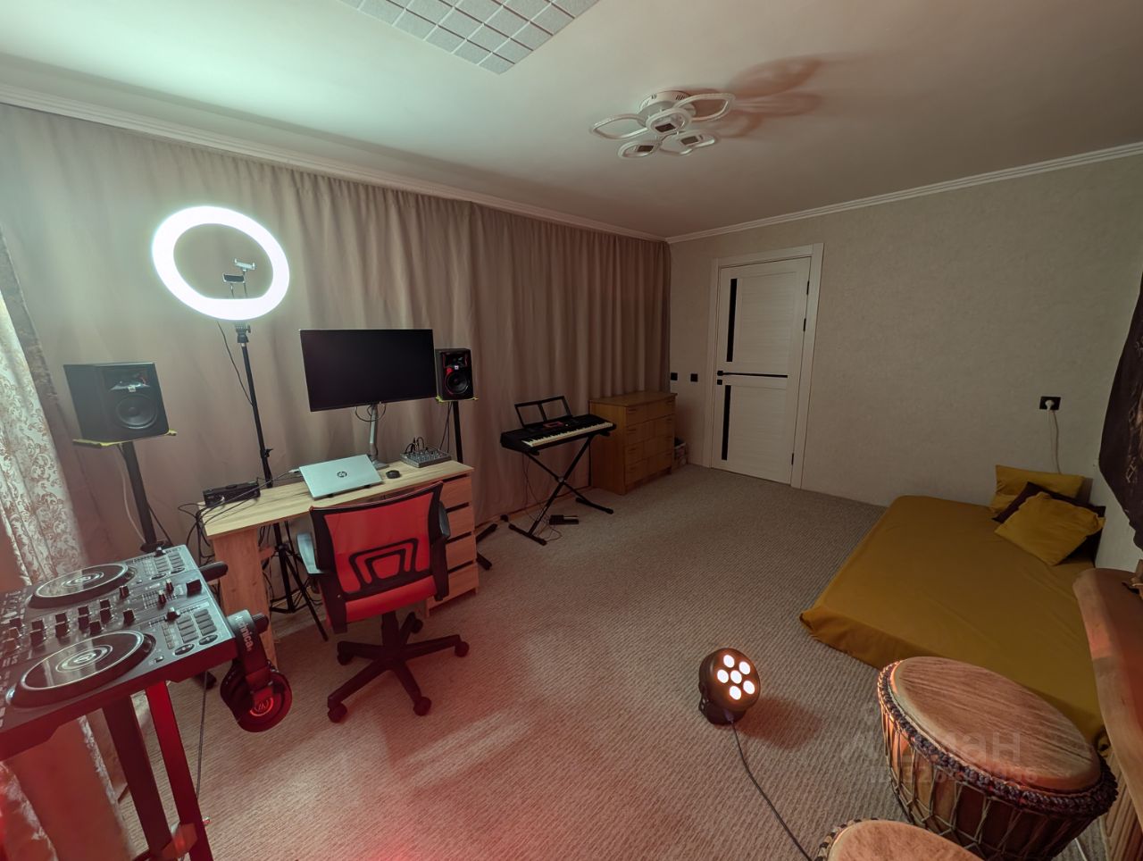 Про музыкальную студию: В одной из комнат оборудовано место для музыки: установлен диффузор из ясеня, заглушена стена, на потолке акустические панели, на полу ковролин. Помещение хорошо подходит для занятий музыкой, записи песен и/или сосредоточенной работы.