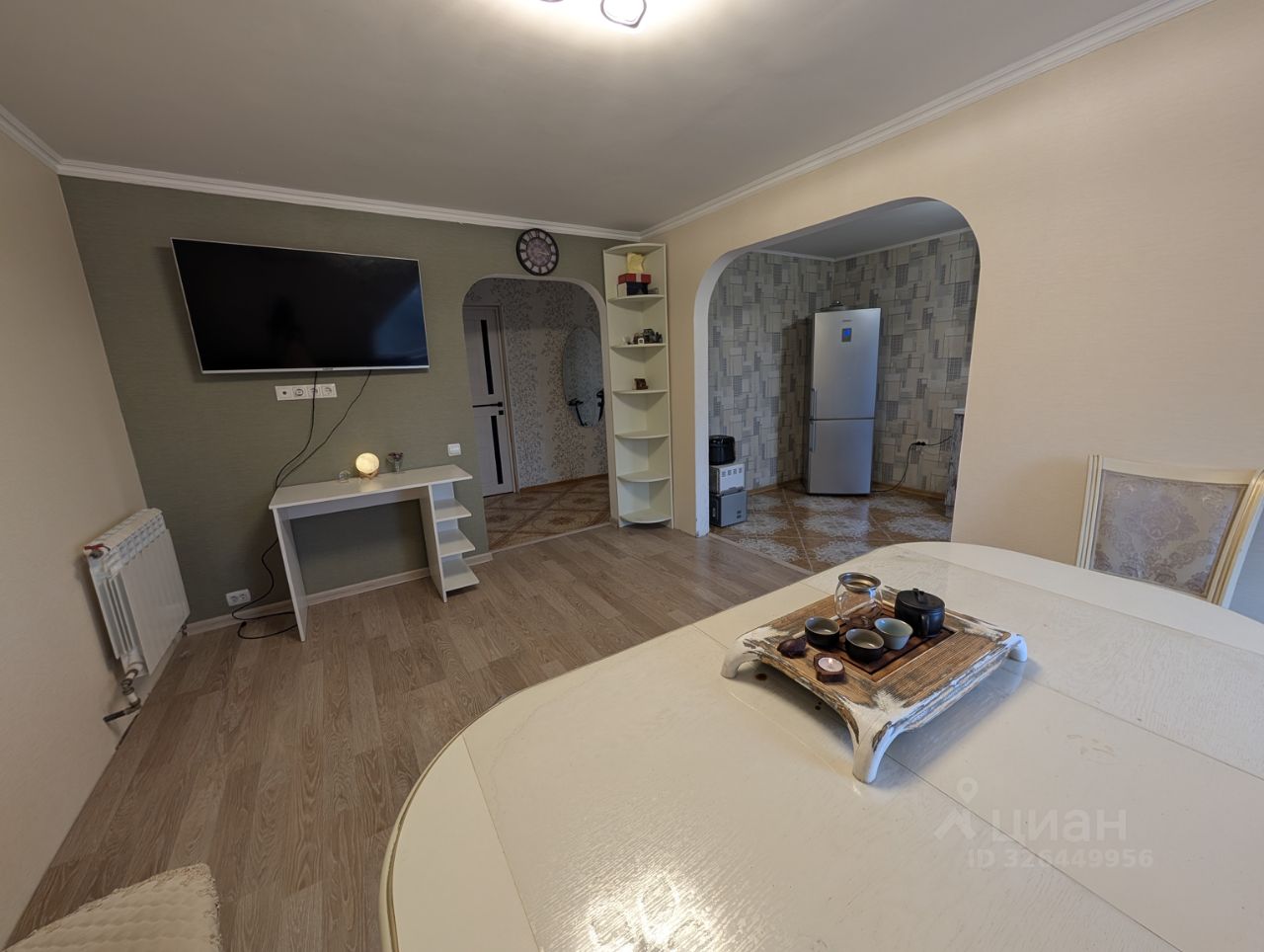 • Просторная гостиная в светлых спокойных тонах с большим столом для дружеских посиделок, совместного просмотра ТВ;