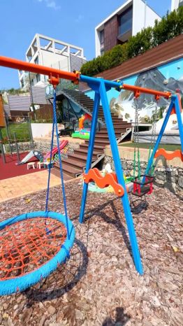 Детский рай: полноценная площадка с качелями, батутом и мини-скалодромом.