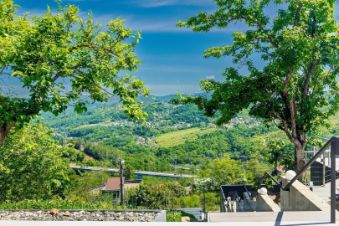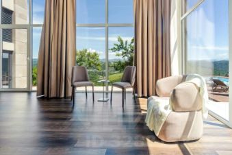 Территория закрытая, с видеонаблюдением, бассейн с подогревом, оборудована зона для загара с шезлонгами и зонтами. Термальная зона с баней на дровах, а также беседка с барбекю. На участке озеленение с тропическими растениями (киви, лимон, виноград, инжир), ландшафтная подсветка, несколько зон с уличной садовой мебелью и потрясающими видовыми характеристиками, есть стол для пинг понга.