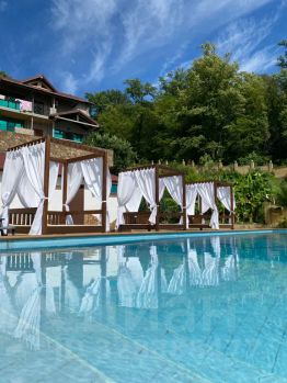 Деревянный эко-коттедж 7 площадью 130 м² построен из экологически чистого материала — деревянного бруса. Расположен в коттеджном комплексе "Усадьба" по ул. Звёздная, 22, Хостинский район. Арендуемая часть занимает второй и третий этажи с отдельным входом. В коттедже уютная гостиная, отдельная кухня с обеденной зоной, 2 просторные спальни с санузлами. Есть возможность размещения дополнительно двух гостей. Открытая терраса и балконы с панорамным видом на Чёрное море. Коттедж оборудован всей необходимой техникой и мебелью для комфортного проживания. Ландшафтный дизайн, зона барбекю, декоративный пруд с карпами, русская баня на дровах, открытый бассейн. Крытая парковка, круглосуточное видеонаблюдение.