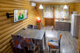 В коттедже имеется кухня и все необходимое для приготовления пищи. Напольное покрытие - кафель. В коттедже имеется холодильник, телевизор, кондиционер сплит-система, фен, обеденный стол, диван, электрочайник, микроволновая печь, стиральная машинка, посуда, плита . В номере собственный санузел с душем. Номера комплектуются набором полотенец на каждого гостя (банное, лицевое) и полотенце для ног. В ванной комнате есть мыло, шампунь, гель для душа.