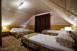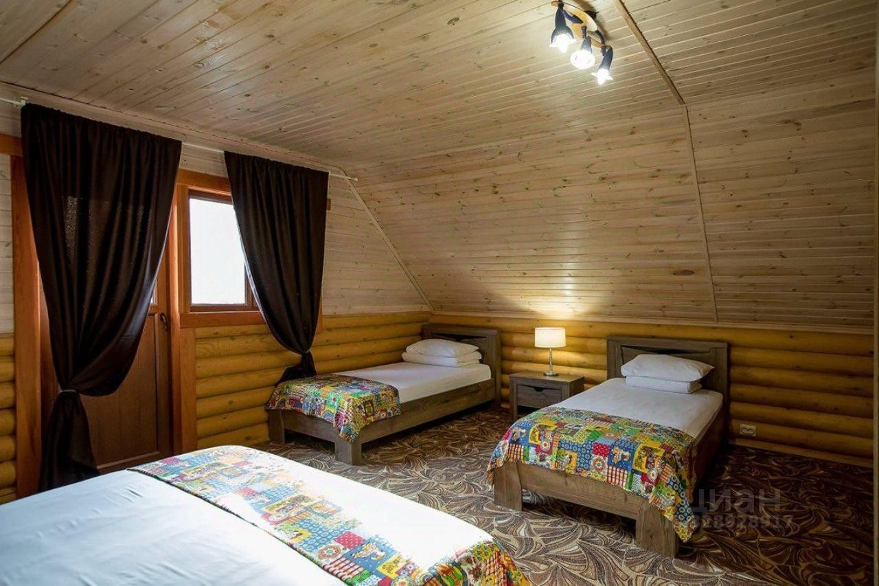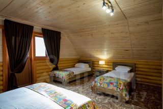 Спальня на втором этаже : две односпальные кровати и одна большая двуспальная кровать. На втором этаже коттеджа есть балкон.