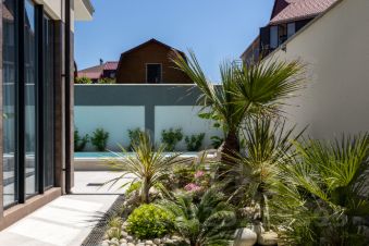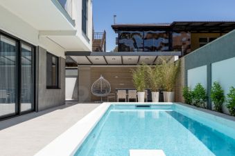 На участке располагается мангал с летней кухней и ротанговой мебелью, зона лежаков, зелёная зона с экзотическими растениями, парковка на 4 автомобиля. Вся территория находится под видеонаблюдением, а дом под охранной сигнализацией.
