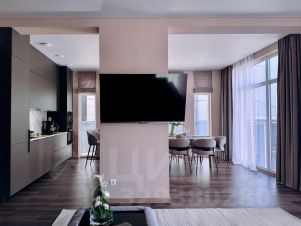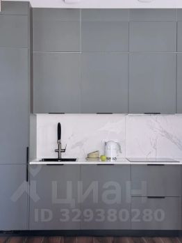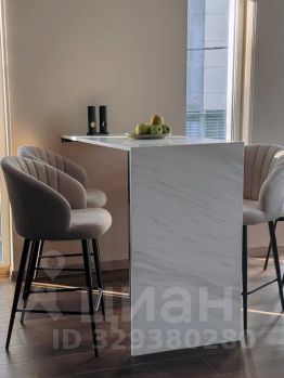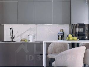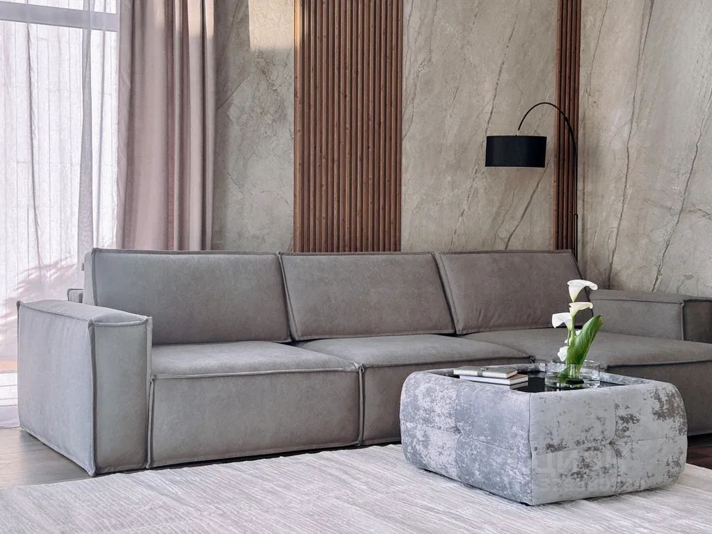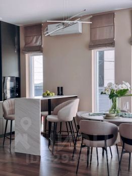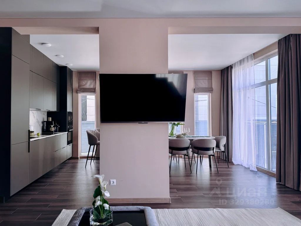 Кухнягостиная — светлое и просторное пространство для совместных ужинов и отдыха, выполненное в современном стиле с акцентом на функциональность и эстетику. В зоне отдыха расположен двухместный диван.