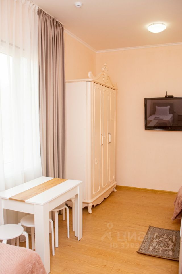Спальня - одна двуспальная кровать 180*200 см, прикроватная тумбочка, туалетный столик, гардероб с вешалками, обеденный стол, 5 стульев, телевизор, кондиционер, гладильная доска, утюг.