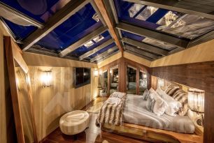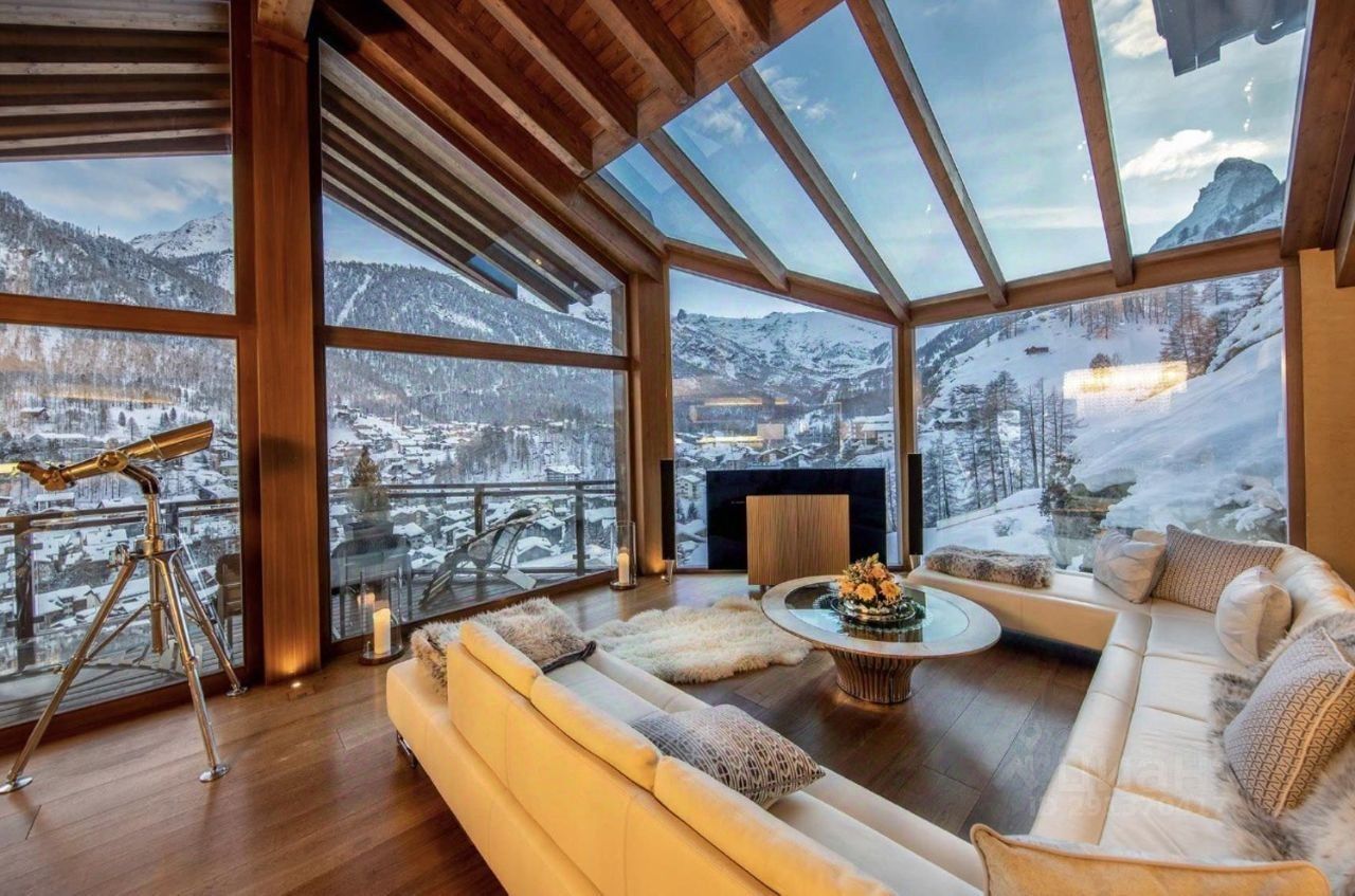 Шале спроектировано известным архитектором-дизайнером Paul Bowyer и представляет собой яркий пример удивительного сочетания дерева, стекла и камня с панорамными окнами от пола до потолка, максимально открывающими живописные виды.