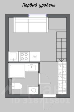 В студии имеется всё для проживания: кухня, холодильник, микроволновая печь, диван, стол, шкаф, лестница-стеллаж, свой совмещенный с/у, дополнительное спальное место и стеллаж на втором уровне.
