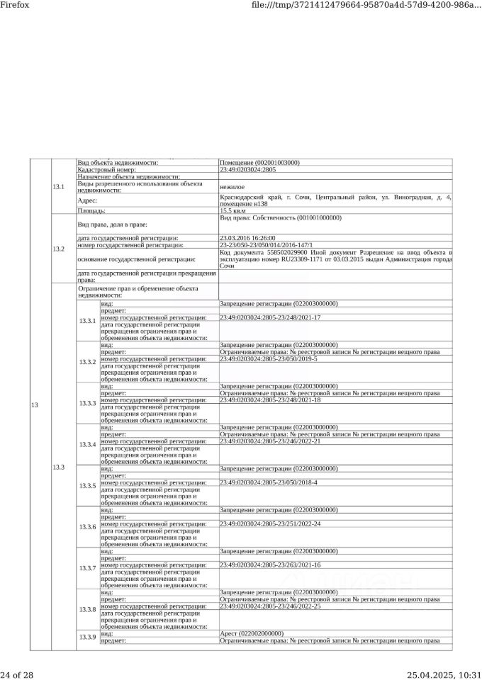 Д-к: ТСЖ "Учитель" Нежилое помещение, площадь 15,5 кв.м., кадастровый номер 23:49:0203024:2805. Адрес: Краснодарский край, г. Сочи, ул. Виноградная, дом 4, помещение н138. Начальная цена 1 236 495 (НДС не облагается) руб., задаток 185 475 руб., шаг аукциона 12 365 руб., ув.523