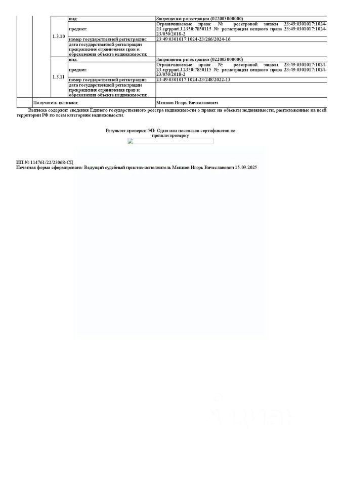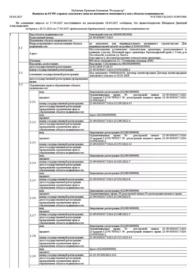 Д-к: Шендеров Д.А. Земельный участок (для индивидуального жилищного строительства), площадь 980 кв.м., кадастровый номер 23:49:0301017:1024. Местонахождение: Краснодарский край, г. Сочи, Хостинский район, в районе улицы Бытха. Начальная цена 60 947 975 руб., задаток 9 142 197 руб., шаг аукциона 609 480 руб., ув. 1246