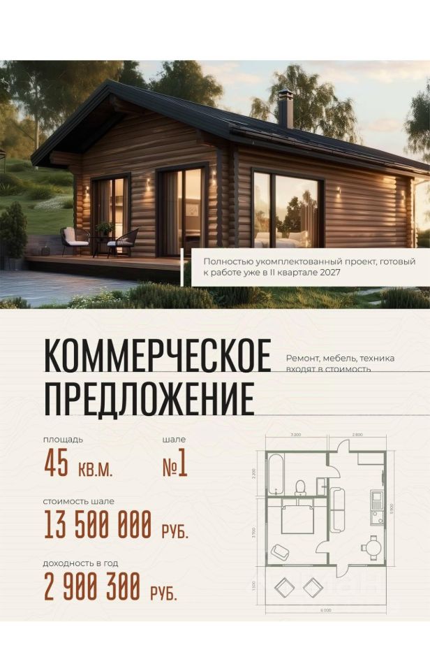 Ваша доходная инвестиция в круглогодичный эко-отель рядом с морем, Адлером, Сириусом и Красной Поляной! 35 домов в стиле шале - архитектурное решение, которое идеально подчёркивает атмосферу уединения в горах над уровнем моря 240 метров и приватной территории в 1 Га. Это новая точка притяжения, способная приносить высокий доход инвесторам. Максимальная загрузка круглый год. Срок окупаемости 5 лет. Первый взнос 7.000.000₽ остальное в беспроцентную рассрочку на полтора года. Идеальная копилка. Подробнее вышлю презентацию