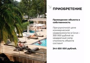 Инвестиционное предложение. Продается помещение под ресторан на центральной улице Адлера в курортном городке . Излюбленное место туристов и местных жителей. Общая площадь 579 кв м из низ 120 кв м зона кухни. Ресторан находится на красной линии, с отдельной входной группой, с парковочными местами для автомобилей на закрытой территории на 20 мест и рядом с рестораном . С очень большим пешим и автомобильным трафиком. В помещение ранее располагался популярный в ресторан. Все коммуникации центральные, газовый котёл. Мощность электричества 180 кВт. Высота потолков от 3 до 4 м. Год постройки 2008. Построен из каркасного шлакоблока. Продавец юридическое лицо. Если вы не ресторатор, а инвестор , то мы поможем вам найти арендатора. Также есть другие варианты взаимодействия. Звоните .