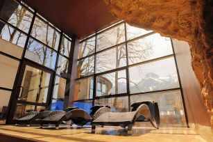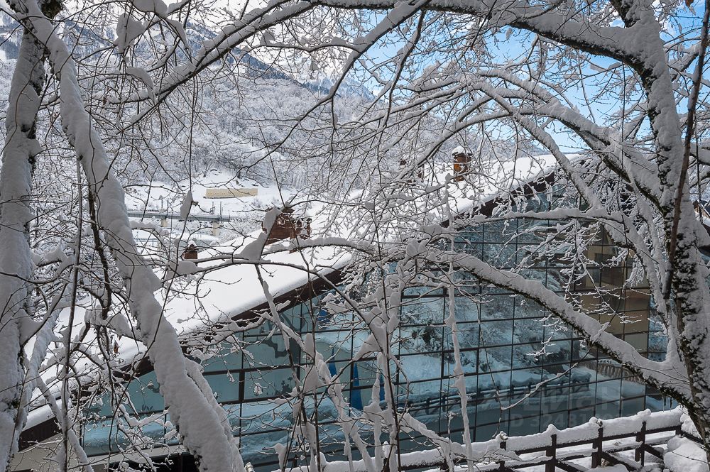 Благодаря дизайнерскому решению здание отеля органично вписалось в горный ландшафт, а из окон номеров открываются виды на заснеженные вершины Кавказских гор и девственный заповедный лес.