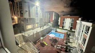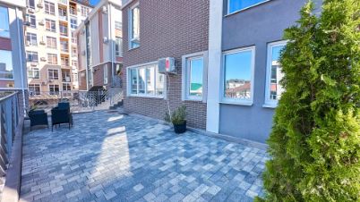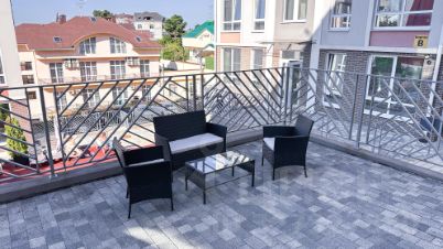 Находится на первом этаже гостиничного комплекса Вилла Далила. Со стороны гор этот этаж является цоколем. Имеется своя терраса с уличной мебелью, бесплатный подогреваемый бассейн, своя бесплатная парковка(!) на территории комплекса.