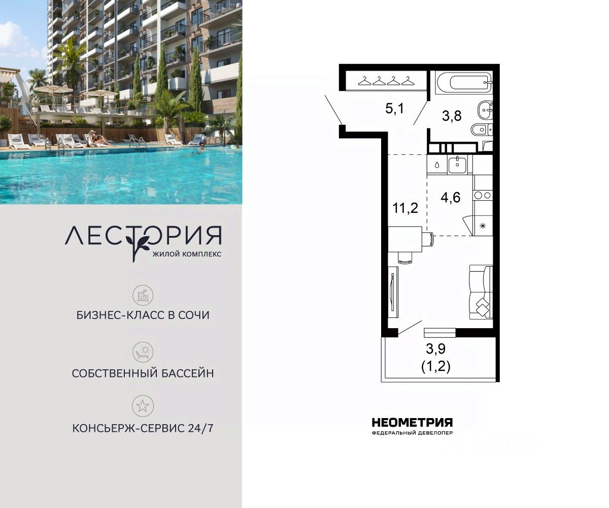 Продается квартира в жилом комплексе бизнес-класса "Лестория". В составе ЖК предусмотрена собственная аквазона площадью 473 квадратных метра с двумя подогреваемыми бассейнами, что соответствуют стандартам бизнес-класса. Аквазона объединяет взрослый и детский бассейны. В welcome-zone к услугам посетителей шезлонги и все необходимые принадлежности. Раздевалки с душевыми комнатами, инфракрасная сауна — здесь все предусмотрено для комфортного отдыха и полного расслабления. Для водного комплекса продуман отдельный вход, оборудованный системой контроля и управления доступом (СКУД). Аквазона только часть уникальной инфраструктуры "Лестории", которая включает в себя также благоустроенную территорию с пятьюдесятью функциональными зонами для прогулок, отдыха и занятий спортом, видовые террасы на крышах для отдыха, работы и встреч с друзьями, а также пространство набережной Кудепсты с шезлонгами и перголами. Жилой комплекс "Лестория" состоит из шести домов высотностью от 15 до 17 этажей, окружённых зеленым массивом национального парка. На придомовой территории для жителей предусмотрены закрытые дворы с круглосуточным видеонаблюдением, активити-центр для детей и подростков, тихие зоны для отдыха и медитации. На крышах домов будут созданы зеленые террасы для наслаждения прекрасными видами на море и горы. В проекте предусмотрены разные варианты отделки квартир под потребности покупателей. Тем, кто хочет воплотить в жизнь собственные интерьерные задумки, подойдут квартиры без ремонта. Для комфортной жизни и отдыха в комплексе будет работать круглосуточный консьерж-сервис уровня 5*, который с легкостью закроет все ежедневные потребности: от заказа продуктов и встречи гостей в аэропорту до выгула и дрессировки питомца. К услугам жителей ЖК "Лестория" — собственная управляющая компания, для инвесторов предоставляются услуги доверительного управления.