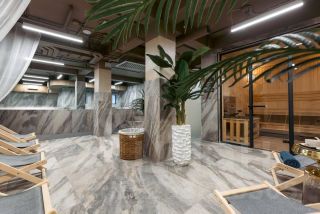 На территории: парковка за шлагбаумом, открытый и крытый бассейны, сауна, хаммам, массажный кабинет и ресторан.