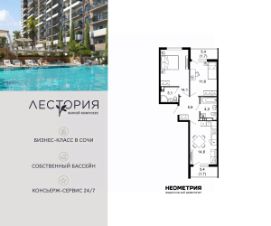Продается квартира в жилом комплексе бизнес-класса "Лестория". В составе ЖК предусмотрена собственная аквазона площадью 473 квадратных метра с двумя подогреваемыми бассейнами, что соответствуют стандартам бизнес-класса. Аквазона объединяет взрослый и детский бассейны. В welcome-zone к услугам посетителей шезлонги и все необходимые принадлежности. Раздевалки с душевыми комнатами, инфракрасная сауна — здесь все предусмотрено для комфортного отдыха и полного расслабления. Для водного комплекса продуман отдельный вход, оборудованный системой контроля и управления доступом (СКУД). Аквазона только часть уникальной инфраструктуры "Лестории", которая включает в себя также благоустроенную территорию с пятьюдесятью функциональными зонами для прогулок, отдыха и занятий спортом, видовые террасы на крышах для отдыха, работы и встреч с друзьями, а также пространство набережной Кудепсты с шезлонгами и перголами. Жилой комплекс "Лестория" состоит из шести домов высотностью от 15 до 17 этажей, окружённых зеленым массивом национального парка. На придомовой территории для жителей предусмотрены закрытые дворы с круглосуточным видеонаблюдением, активити-центр для детей и подростков, тихие зоны для отдыха и медитации. На крышах домов будут созданы зеленые террасы для наслаждения прекрасными видами на море и горы. В проекте предусмотрены разные варианты отделки квартир под потребности покупателей. Тем, кто хочет воплотить в жизнь собственные интерьерные задумки, подойдут квартиры без ремонта. Для комфортной жизни и отдыха в комплексе будет работать круглосуточный консьерж-сервис уровня 5*, который с легкостью закроет все ежедневные потребности: от заказа продуктов и встречи гостей в аэропорту до выгула и дрессировки питомца. К услугам жителей ЖК "Лестория" — собственная управляющая компания, для инвесторов предоставляются услуги доверительного управления.