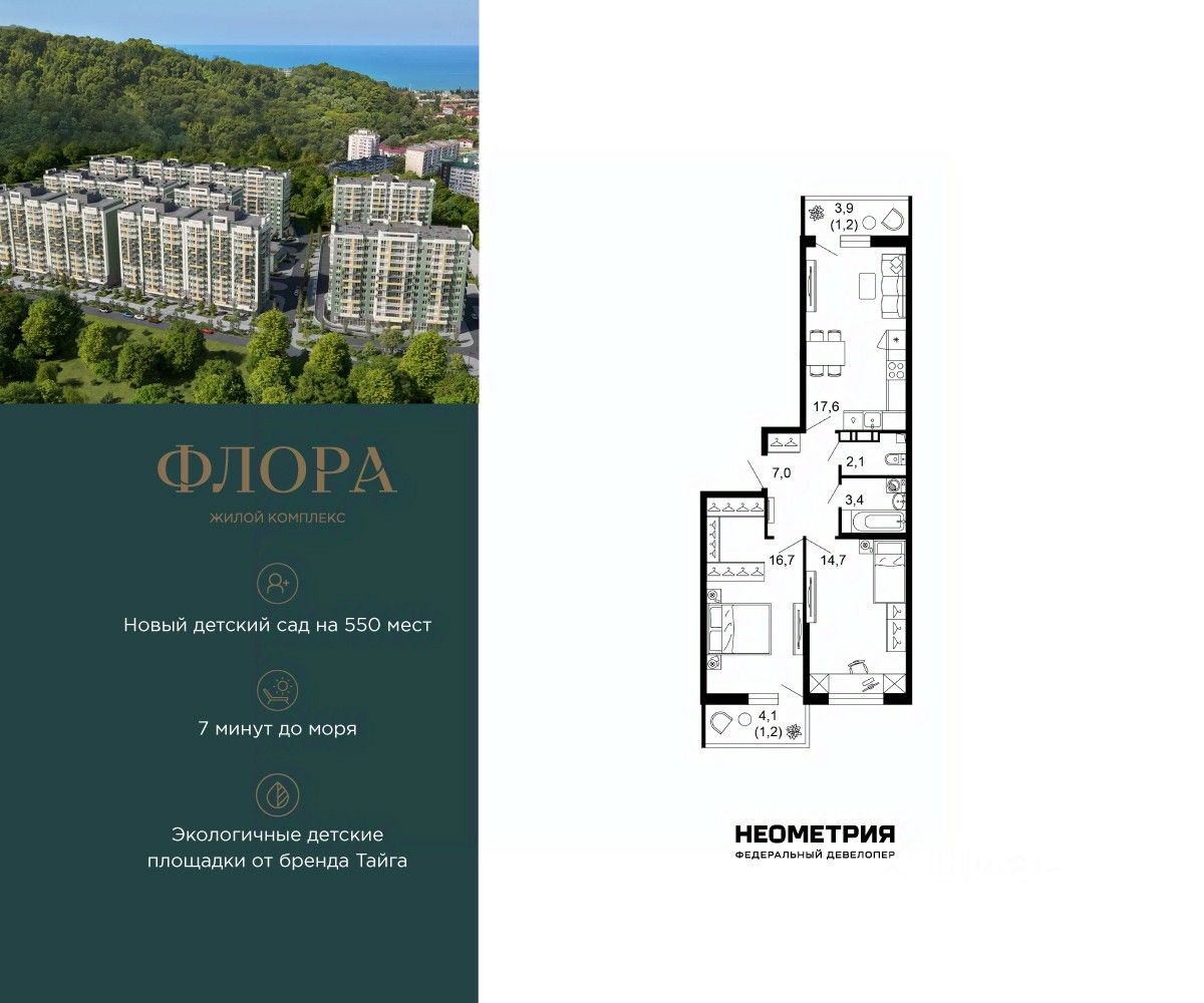 Продается квартира в ЖК "Флора" от федерального девелопера "Неометрия". Это жилой комплекс комфорт-класса в самом зеленом районе Сочи. При проектировании постарались максимально сохранить окружающую флору и фауну. Теплое море, горы, целебные источники, река, близость заповедника все это уже рядом с вами.