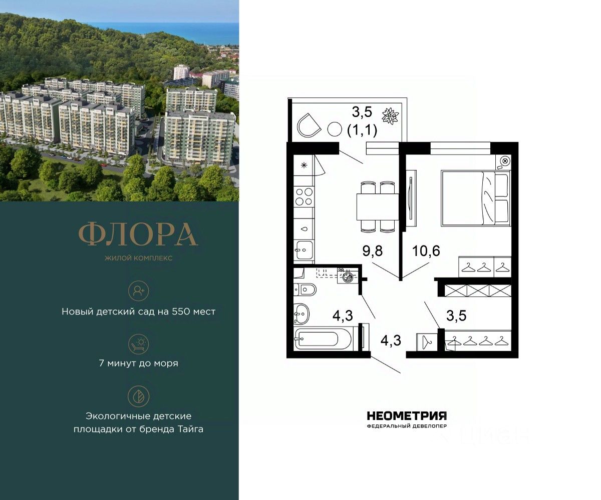 Продается квартира в ЖК "Флора" от федерального девелопера "Неометрия". Это жилой комплекс комфорт-класса в самом зеленом районе Сочи. При проектировании постарались максимально сохранить окружающую флору и фауну. Теплое море, горы, целебные источники, река, близость заповедника все это уже рядом с вами. Жилой комплекс "Флора" это: • 4,5 Га благоустроенной территории от дизайн-бюро Cora * 7 минут до моря на машине • Современные экологичные детские площадки от бренда "Тайга" • Яркие аллеи с цветниками и кустарниками для прогулок и утренних пробежек • Благоустроенная набережная с шезлонгами и перголами • Спортивные зоны для любителей пляжного волейбола, бадминтона и йоги - лапомоечные и колясочные в каждом подъезде - подземный паркинг на 429 мест Собственная управляющая компания с функцией "доверительного управления" Кудепста это прекрасный зеленый оазис, который расположился между историческим центром Сочи и Адлером. Благодаря выгодному местоположению ЖК "Флора" между курортным Адлером и центром Сочи до самых популярных социальных, культурных и развлекательных объектов города можно добраться за считанные минуты: Олимпийский парк. Красная Поляна, аэропорт, жд-вокзал. Кроме того, в шаговой доступности расположена вся необходимая социальная инфраструктура, что удобно для жизни всех членов семьи: • 2 школы; • 3 детских сада; • 3 поликлиники; • 2 фитнес-центра; • 3 магазина и гипермаркета; • спортивная школа • 2 остановки общественного транспорта. На первых этажах комплекса расположены коммерческие помещения пункты выдачи маркетплейсов, кофейни, магазины. В жилом комплексе соблюден принцип сбалансированных и эргономичных планировочных решений: от компактных студий до просторных семейных квартир. В каждой квартире есть балкон, и установлены увеличенные оконные рамы. На 12 этаже повышенной комфортности открываются потрясающие виды на море и национальный парк благодаря панорамному остеклению лоджий. Квартиру можно купить с черновой отделкой или с готовым ремонтом "Прайм", а также с сертификатом на покупку мебели. Приобрести квартиру можно за наличную оплату, в ипотеку, с привлечением средства маткапитала.