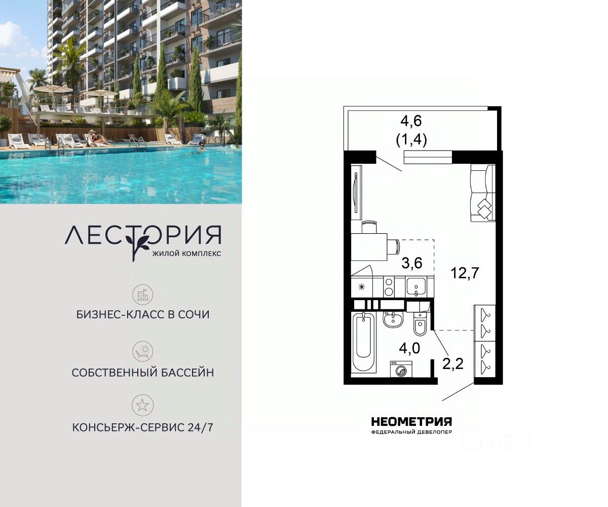Продается квартира в жилом комплексе бизнес-класса "Лестория". В составе ЖК предусмотрена собственная аквазона площадью 473 квадратных метра с двумя подогреваемыми бассейнами, что соответствуют стандартам бизнес-класса. Аквазона объединяет взрослый и детский бассейны. В welcome-zone к услугам посетителей шезлонги и все необходимые принадлежности. Раздевалки с душевыми комнатами, инфракрасная сауна — здесь все предусмотрено для комфортного отдыха и полного расслабления. Для водного комплекса продуман отдельный вход, оборудованный системой контроля и управления доступом (СКУД). Аквазона только часть уникальной инфраструктуры "Лестории", которая включает в себя также благоустроенную территорию с пятьюдесятью функциональными зонами для прогулок, отдыха и занятий спортом, видовые террасы на крышах для отдыха, работы и встреч с друзьями, а также пространство набережной Кудепсты с шезлонгами и перголами. Жилой комплекс "Лестория" состоит из шести домов высотностью от 15 до 17 этажей, окружённых зеленым массивом национального парка. На придомовой территории для жителей предусмотрены закрытые дворы с круглосуточным видеонаблюдением, активити-центр для детей и подростков, тихие зоны для отдыха и медитации. На крышах домов будут созданы зеленые террасы для наслаждения прекрасными видами на море и горы. В проекте предусмотрены разные варианты отделки квартир под потребности покупателей. Тем, кто хочет воплотить в жизнь собственные интерьерные задумки, подойдут квартиры без ремонта. Для комфортной жизни и отдыха в комплексе будет работать круглосуточный консьерж-сервис уровня 5*, который с легкостью закроет все ежедневные потребности: от заказа продуктов и встречи гостей в аэропорту до выгула и дрессировки питомца. К услугам жителей ЖК "Лестория" — собственная управляющая компания, для инвесторов предоставляются услуги доверительного управления.