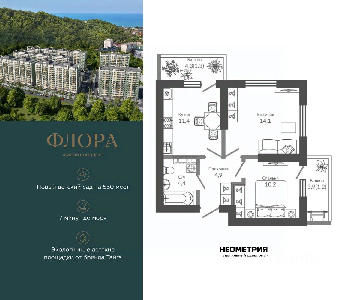 Продается квартира в ЖК "Флора" от федерального девелопера "Неометрия". Это жилой комплекс комфорт-класса в самом зеленом районе Сочи. При проектировании постарались максимально сохранить окружающую флору и фауну. Теплое море, горы, целебные источники, река, близость заповедника все это уже рядом с вами. Жилой комплекс "Флора" это: • 4,5 Га благоустроенной территории от дизайн-бюро Cora * 7 минут до моря на машине • Современные экологичные детские площадки от бренда "Тайга" • Яркие аллеи с цветниками и кустарниками для прогулок и утренних пробежек • Благоустроенная набережная с шезлонгами и перголами • Спортивные зоны для любителей пляжного волейбола, бадминтона и йоги - лапомоечные и колясочные в каждом подъезде - подземный паркинг на 429 мест Собственная управляющая компания с функцией "доверительного управления" Кудепста это прекрасный зеленый оазис, который расположился между историческим центром Сочи и Адлером. Благодаря выгодному местоположению ЖК "Флора" между курортным Адлером и центром Сочи до самых популярных социальных, культурных и развлекательных объектов города можно добраться за считанные минуты: Олимпийский парк. Красная Поляна, аэропорт, жд-вокзал. Кроме того, в шаговой доступности расположена вся необходимая социальная инфраструктура, что удобно для жизни всех членов семьи: • 2 школы; • 3 детских сада; • 3 поликлиники; • 2 фитнес-центра; • 3 магазина и гипермаркета; • спортивная школа • 2 остановки общественного транспорта. На первых этажах комплекса расположены коммерческие помещения пункты выдачи маркетплейсов, кофейни, магазины. В жилом комплексе соблюден принцип сбалансированных и эргономичных планировочных решений: от компактных студий до просторных семейных квартир. В каждой квартире есть балкон, и установлены увеличенные оконные рамы. На 12 этаже повышенной комфортности открываются потрясающие виды на море и национальный парк благодаря панорамному остеклению лоджий. Квартиру можно купить с черновой отделкой или с готовым ремонтом "Прайм", а также с сертификатом на покупку мебели. Приобрести квартиру можно за наличную оплату, в ипотеку, с привлечением средства маткапитала.