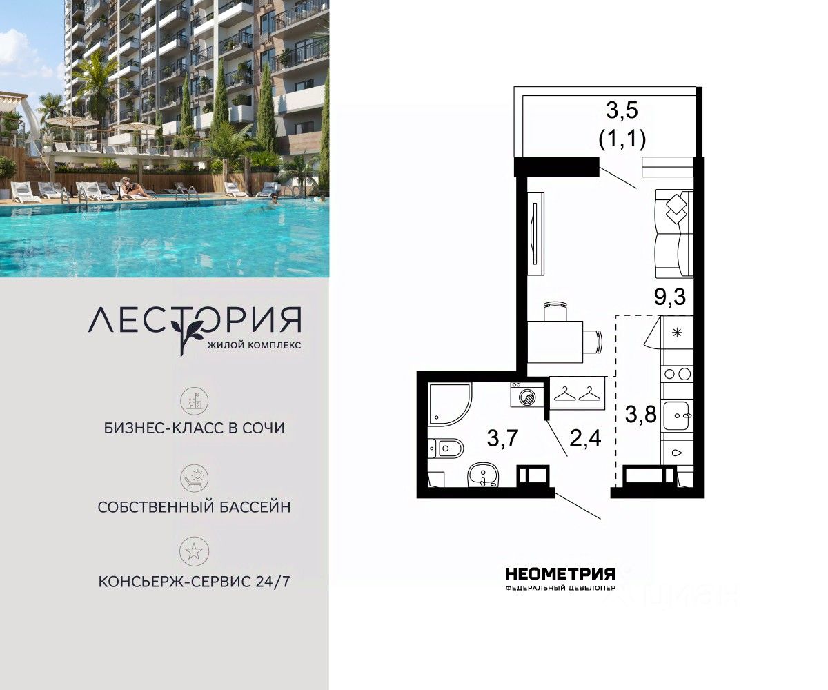 Продается квартира в жилом комплексе бизнес-класса "Лестория". В составе ЖК предусмотрена собственная аквазона площадью 473 квадратных метра с двумя подогреваемыми бассейнами, что соответствуют стандартам бизнес-класса. Аквазона объединяет взрослый и детский бассейны. В welcome-zone к услугам посетителей шезлонги и все необходимые принадлежности. Раздевалки с душевыми комнатами, инфракрасная сауна — здесь все предусмотрено для комфортного отдыха и полного расслабления. Для водного комплекса продуман отдельный вход, оборудованный системой контроля и управления доступом (СКУД). Аквазона только часть уникальной инфраструктуры "Лестории", которая включает в себя также благоустроенную территорию с пятьюдесятью функциональными зонами для прогулок, отдыха и занятий спортом, видовые террасы на крышах для отдыха, работы и встреч с друзьями, а также пространство набережной Кудепсты с шезлонгами и перголами. Жилой комплекс "Лестория" состоит из шести домов высотностью от 15 до 17 этажей, окружённых зеленым массивом национального парка. На придомовой территории для жителей предусмотрены закрытые дворы с круглосуточным видеонаблюдением, активити-центр для детей и подростков, тихие зоны для отдыха и медитации. На крышах домов будут созданы зеленые террасы для наслаждения прекрасными видами на море и горы. В проекте предусмотрены разные варианты отделки квартир под потребности покупателей. Тем, кто хочет воплотить в жизнь собственные интерьерные задумки, подойдут квартиры без ремонта. Для комфортной жизни и отдыха в комплексе будет работать круглосуточный консьерж-сервис уровня 5*, который с легкостью закроет все ежедневные потребности: от заказа продуктов и встречи гостей в аэропорту до выгула и дрессировки питомца. К услугам жителей ЖК "Лестория" — собственная управляющая компания, для инвесторов предоставляются услуги доверительного управления.