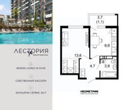 Продается квартира в жилом комплексе бизнес-класса "Лестория". В составе ЖК предусмотрена собственная аквазона площадью 473 квадратных метра с двумя подогреваемыми бассейнами, что соответствуют стандартам бизнес-класса. Аквазона объединяет взрослый и детский бассейны. В welcome-zone к услугам посетителей шезлонги и все необходимые принадлежности. Раздевалки с душевыми комнатами, инфракрасная сауна — здесь все предусмотрено для комфортного отдыха и полного расслабления. Для водного комплекса продуман отдельный вход, оборудованный системой контроля и управления доступом (СКУД). Аквазона только часть уникальной инфраструктуры "Лестории", которая включает в себя также благоустроенную территорию с пятьюдесятью функциональными зонами для прогулок, отдыха и занятий спортом, видовые террасы на крышах для отдыха, работы и встреч с друзьями, а также пространство набережной Кудепсты с шезлонгами и перголами. Жилой комплекс "Лестория" состоит из шести домов высотностью от 15 до 17 этажей, окружённых зеленым массивом национального парка. На придомовой территории для жителей предусмотрены закрытые дворы с круглосуточным видеонаблюдением, активити-центр для детей и подростков, тихие зоны для отдыха и медитации. На крышах домов будут созданы зеленые террасы для наслаждения прекрасными видами на море и горы. В проекте предусмотрены разные варианты отделки квартир под потребности покупателей. Тем, кто хочет воплотить в жизнь собственные интерьерные задумки, подойдут квартиры без ремонта. Для комфортной жизни и отдыха в комплексе будет работать круглосуточный консьерж-сервис уровня 5*, который с легкостью закроет все ежедневные потребности: от заказа продуктов и встречи гостей в аэропорту до выгула и дрессировки питомца. К услугам жителей ЖК "Лестория" — собственная управляющая компания, для инвесторов предоставляются услуги доверительного управления.